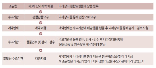 제3자 단가계약은 조달청에서 입찰을 통해 업체와 계약을 체결하고 나라장터 종합쇼핑몰 http://shopping.g2b.go.kr/)에 상품을 등록하면 수요기관이 필요한 제품을 요구하여 납품받는 절차로 운영된다.