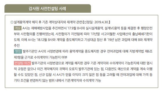 계약의 해제·해지에 따른 수의계약은 예를 들어 해당 사업을 특정 시점까지 시급히 추진해야 하는데 입찰 등을 거치면서 기간이 많이 경과되거나 이미 계약 이행이 어느 정도 진행되어 경쟁 입찰절차를 다시 거치는 것이 비효율적인 경우 등 일반적인 신규 계약 추진과는 다른 상황이 발생할 수 있어 발주기관의 판단 하에 수의계약을 할 수 있도록 한 것이다.