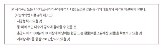 ⑤ (지방계약) 지역사회의 개발을 위하여 그 지역주민의 다수를 참여시킬 필요가 있는 경우로서 추정가격이 2천만 원 미만인 공사 또는 추정가격이 5천만 원 미만인 묘목재배를 행정안전부령으로 정하는 그 지역의 주민 또는 대표자와 직접 계약하는 경우