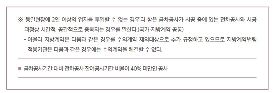 ② 작업상 혼란이 초래될 우려가 있는 등 동일 현장에서 2인 이상의 시공자가 공사를 할 수 없는 경우로서 현재의 시공자와 계약을 하는 경우(계속공사)
