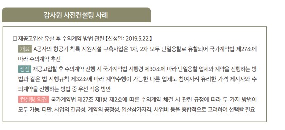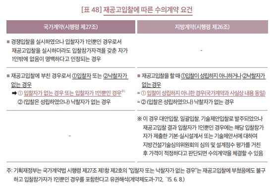 위 가~마의 수의계약 사유 외에도 [표 48]과 같이 재공고입찰 결과에 따라서도 수의계약을 체결할 수 있는데, 이는 입찰자가 없는 등의 사유로 재공고입찰을 하였는데도 역시 입찰자나 낙찰자가 없어 계약상대자를 찾기 어려운 경우에는 발주기관의 재량으로 수의계약을 할 수 있도록 한 것이다.