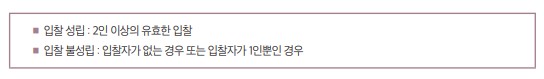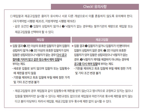 그리고 재공고입찰을 실시한 경우에도 국가계약과 지방계약의 수의계약 요건이 다른 것처럼 보이나 국가계약법 시행령 제11조 및 지방계약법 시행령 제12조에 따르면 경쟁입찰은 2인 이상의 유효한 입찰로 성립한다고 되어 있어 ‘입찰자가 없는 경우’나 ‘입찰자가 1인뿐인 경우’는 결국 ‘입찰이 성립하지 아니한 경우’이므로 사실상 그 내용은 동일하다.