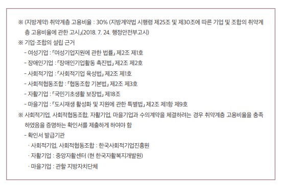 ①-마 추정가격이 2천만 원 초과 1억 원(국가), 5천만 원(지방-단, 코로나19 관련 한시적 특례 적용기간동안 1억 원) 이하인 계약으로서 여성기업, 장애인기업, 사회적기업, 사회적협동조합, 자활기업, 마을기업(기획재정부장관 또는 행정안전부장관이 정한 기준에 적합한 기업만 해당)과 체결하는 물품의 제조·구매계약 또는 용역계약. 단, 사회적기업, 사회적협동조합, 자활기업, 마을기업은 「사회적기업 육성법」제2조 제2호의 취약계증을 전체 근로자의 100분의 30이상 고용한 자이어야 함(지방계약은 취약계층 고용비율을 행정안전부장관이 별도 고시