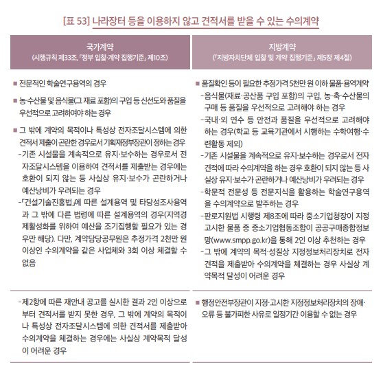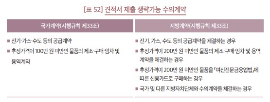 한편, 계약 법령에서는 견적서를 제출받지 않고 계약을 할 수 있는 사항들을 규정하고 있는데 전기·가스가수도의 공급계약과 일정금액(국가: 추정가격 100만 원, 지방: 추정가격 200만 원) 미만 물품(용역)계약은 국가나 지방계약 구분 없이 생략가능 하고 지방계약은 이외에도 [표 52] 와 같이 2가지 사항을 더 규정하고 있다.