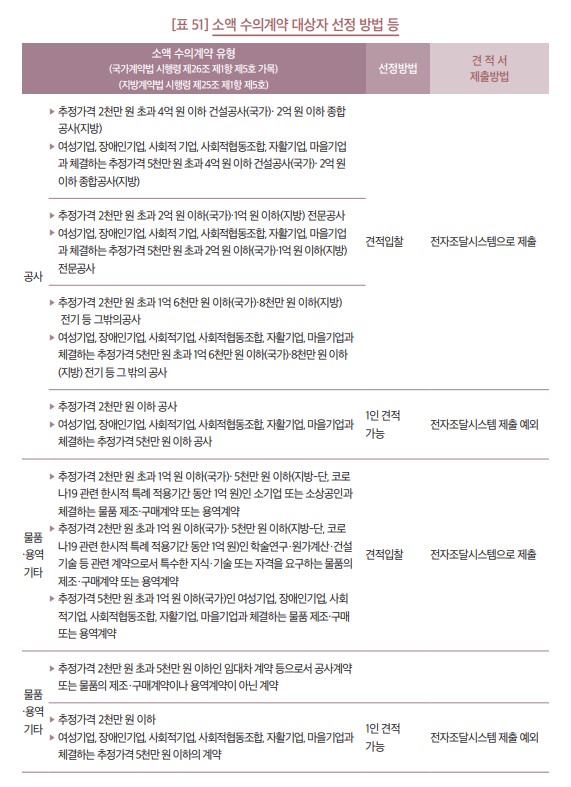 위 금액 기준에 따른 수의계약의 경우 [표 51]과 같이 계약 대상 및 추정 가격 범위 등에 따라 견적 방법이 달라지고 추가적인 기관 내부의 규정도 있으므로, 법령 외에 내부 규정을 함께 검토하여야 한다.