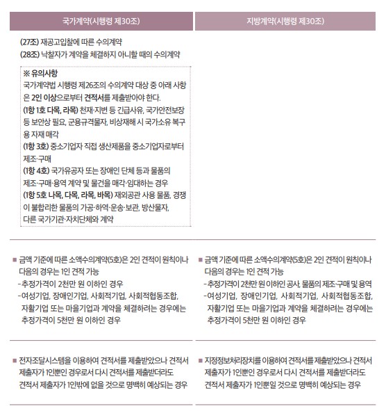 수의계약을 체결하고자 할 때에는 2인 이상으로부터 견적서를 받아야 한다. 단, [표 50]과 같은 경우에는 1인으로부터 받은 견적서에 의할 수 있는데, 국가계약은 수의계약 대상 요건 중 경쟁이 성립될 수 없어 2인 이상으로부터 견적서를 받는 것이 불가능하거나 금액이 소액인 경우 등일부 사항에 대해서만 1인 견적을 허용하고 있는 데 반해 지방계약은 금액 기준에 따른 소액수의계약(지방계약법 시행령 제25조 제1항 제5호) 대상 중 추정가격 2천만 원 이하(여성기업, 장애인기업, 사회적기업, 사회적협동조합, 자활기업, 마을기업은 5천만 원)의 계약을 제외한 모든 사항에 대해서 1인 견적을 허용하고 있는 등 그 요건을 보다 완화하여 정하고 있다.