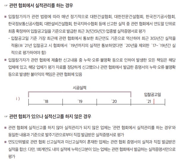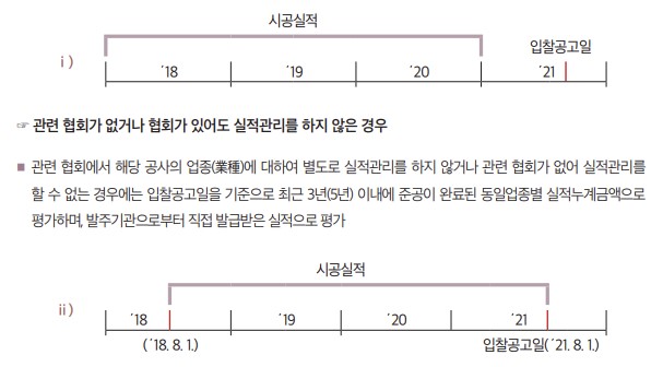유형2와 유형3의 업종별 실적과 관련하여 관련 협회의 실적관리 등 여부와 ‘최근 3(5)년간’ 또는 ‘최근 3년 이상’의 두가지 경우별로 인정기준이 달라지는데, 다음과 같이 ⅰ)연도 기준 최근 3년간 업종별 실적, ⅱ)입찰공고일 기준으로 기산하여 최근 3(5)년 이내에 준공이 완료된 실적, ⅲ)연도 기준 최근 3년간 실적에 그 최종연도의 다음연도 1월 1일부터 입찰공고일까지 준공실적을 합한 실적의 세가지 방법으로 나누어 볼 수 있다.
