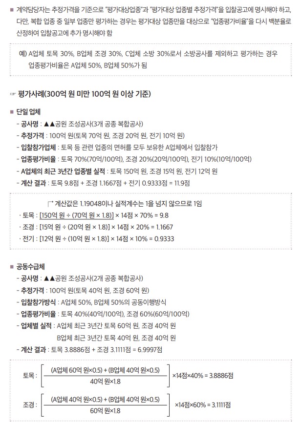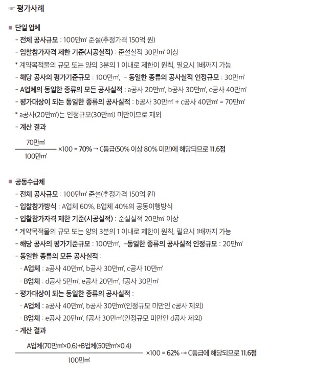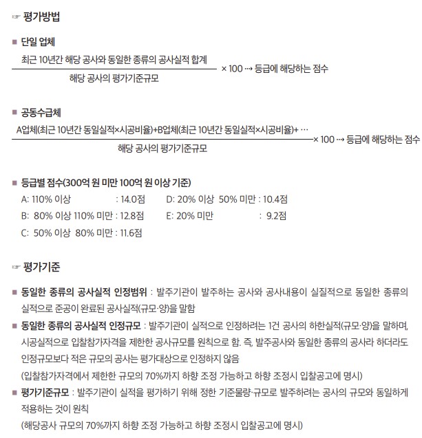 동일한 종류의 공사실적은 공사의 금액이 아닌 규모 또는 양([예시] ㎞, ㎡, ㎥, ㎏, 개, M, 개소 등)을 의미하고, 공사의 특성상 규모·양으로 평가하는 것이 부적정하다고 인정되는 경우 금액 기준으로 평가할 수 있으며 평가기준 등 구체적 내용은 다음과 같다.