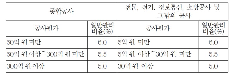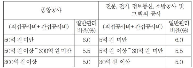 나. 일반관리비는 직접공사비와 간접공사비의 합계액에 일반관리비율을 곱하여 계산한다. 다만, 일반관리비율은 공사규모별로 아래에서 정한 비율을 초과할 수 없다.
