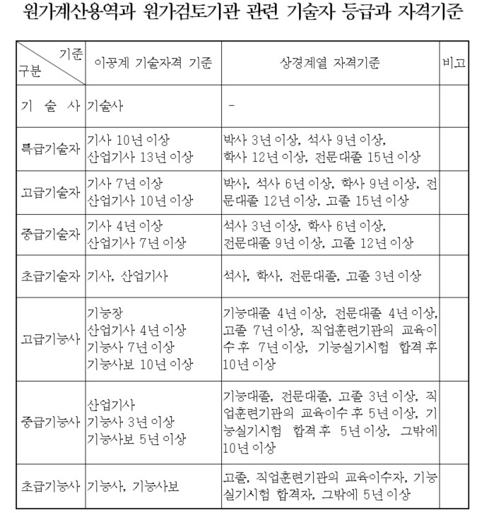 주1) 기술자란 「엔지니어링산업진흥법」 제2조 제1호와 동법 시행령 제2조에 정한 엔지니어링 활동을 직접 수행하는 자로 한다.