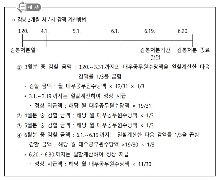 정직 감봉 직위해제 및 휴직으로 봉급이 감액 지급되는 공무원에게는 영 별표 4의 지급구분에 따라 처분기간중 대우공무원수당(가산금을 포함한다)을 감액하여 지급한다.