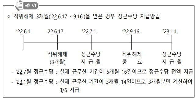* 처분기간이 양 기간에 걸쳐 있지만 처분월수보다 적은 월수분의 정근수당이 감액되는 경우 처분월수만큼 감액하며 처분일이 속하는 지급대상기간의 정근수당을 감액함