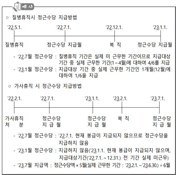 나) 신규 임용된 공무원과 직위해제 또는 휴직처분을 받은 공무원의 경우에는 해당 지급대상 기간 중 공무원으로 실제 근무한 기간(직위해제 처분기간은 실제 근무하지 않은 기간으로 보고, 지방공무원 보수규정 제14조제1호제3호 제3호의2 제3호의3에 따른 휴직기간과 공무상 질병 또는 부상에 의한 휴직기간은 실제 근무한 기간으로 본다)에 따라 아래의 산식과 같이 계산하여 지급한다