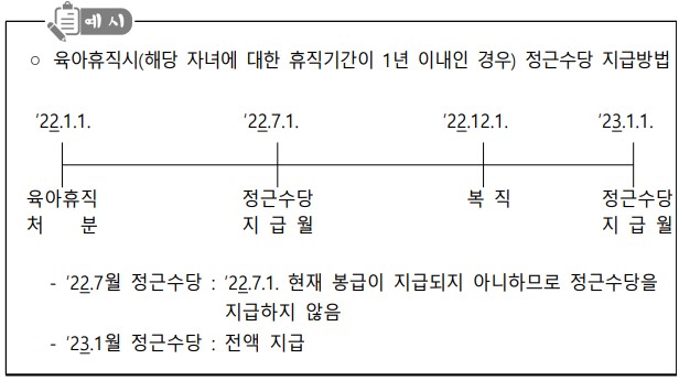 - 첫째, 둘째 자녀에 대한 육아휴직은 최초 1년 이내의 기간만 그 휴직기간을 근무연수에 산입하나, 셋째이후 자녀에 대해서는 육아휴직 전 기간(3년 이내)을 근무연수에 산입하므로, ’23.1~5월까지의 육아휴직기간은 실제 근무한 기간에 포함됨. 따라서, 2023년 7월에 지급하는 정근수당은 전액 지급