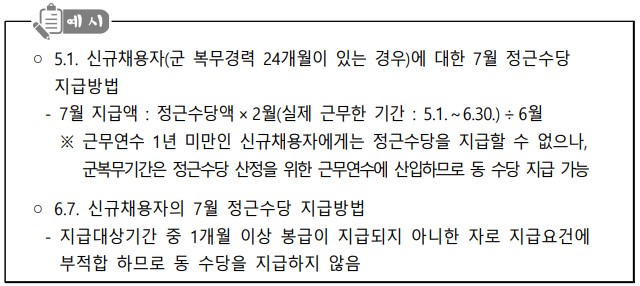 * 전년도 12월 1일(해당연도 6월 1일) 신규채용자는 해당연도 1월(7월)에 영 제6조제1항에 의한 정근수당액의 1/6을 지급하나, 전년도 12월 2일(해당연도 6월 2일)이후에 신규채용된 자의 경우에는 해당연도 1월(7월) 정근수당의 지급요건에 해당되지 않으므로 정근수당을 지급하지 아니한다.