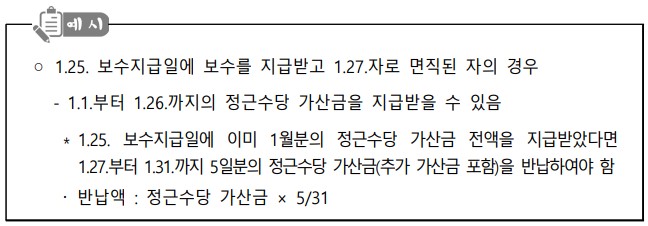 2) 월중 면직(의원면직 직권면직 당연퇴직 파면 해임 등)의 경우 면직일의 전일까지의 일수에 대하여 그 달의 정근수당 가산금(추가 가산금 포함)을 일할 계산하여 지급한다