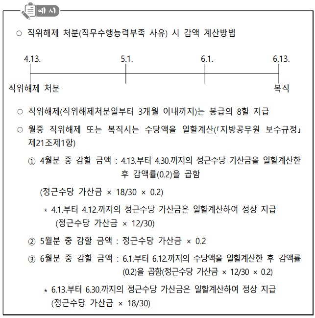 1) 강등(직무에 종사하지 못하는 3개월에 한함) 정직 감봉 직위해제 및 휴직으로 봉급이 감액 지급되는 공무원에게는 영 별표 4의 지급구분에 따라 처분기간 중 정근수당 가산금(추가 가산금을 포함한다)을 감액하여 지급한다.