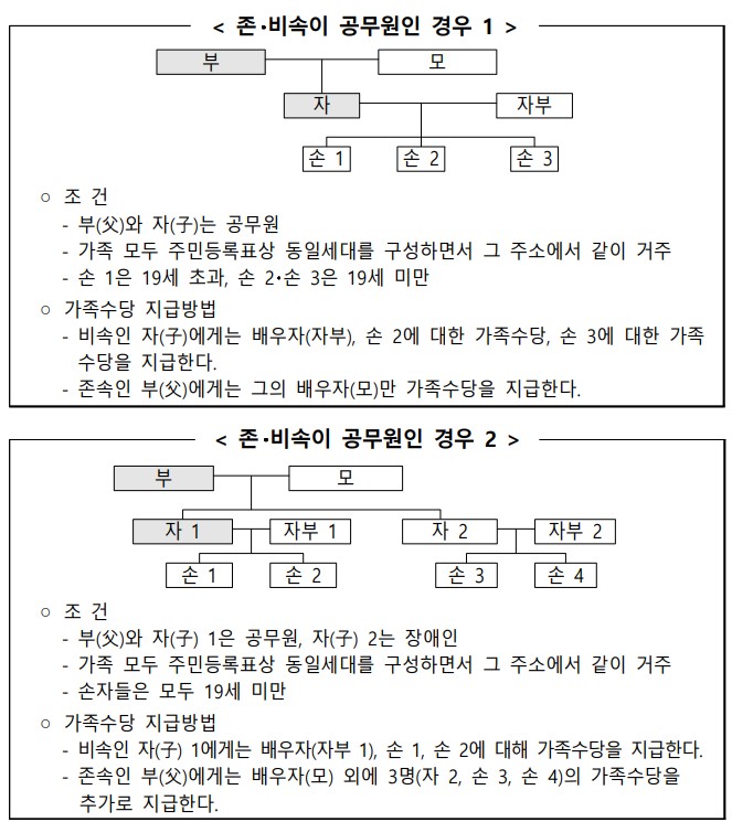 * 다만, 종전 지침에 따라 공무원인 비속의 배우자를 제외한 그의 자(손)에 대해 존속에게 가족수당을 지급하고 있는 경우에는 종전대로 지급할 수 있다