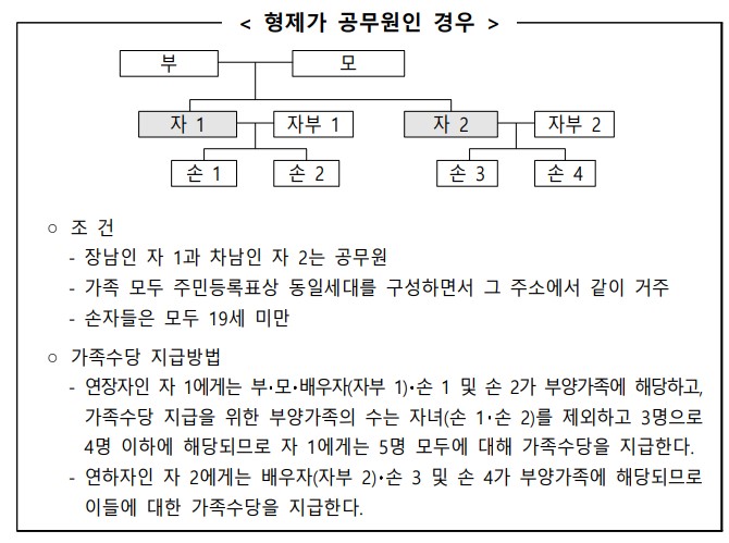 나) 형제 자매가 공무원인 경우 연장자에게 직계존속에 대한 가족수당을 지급하며, 연하자인 공무원은 본인의 배우자 및 직계비속에 대한 가족수당을 지급받을 수 있다.