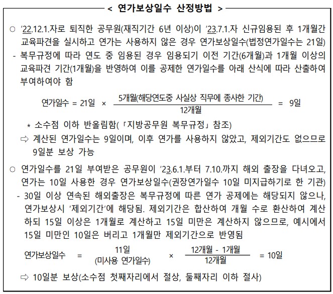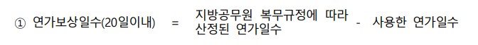 ※ 특별휴가, 공가, 공무상 질병 또는 부상으로 인한 휴직, 공무상 병가, 사병으로 군입대시 입대후의 미근무기간과 복직시 군인으로 복무했던 기간은 연가보상일수 산정의 제외기간에 포함하지 않음.