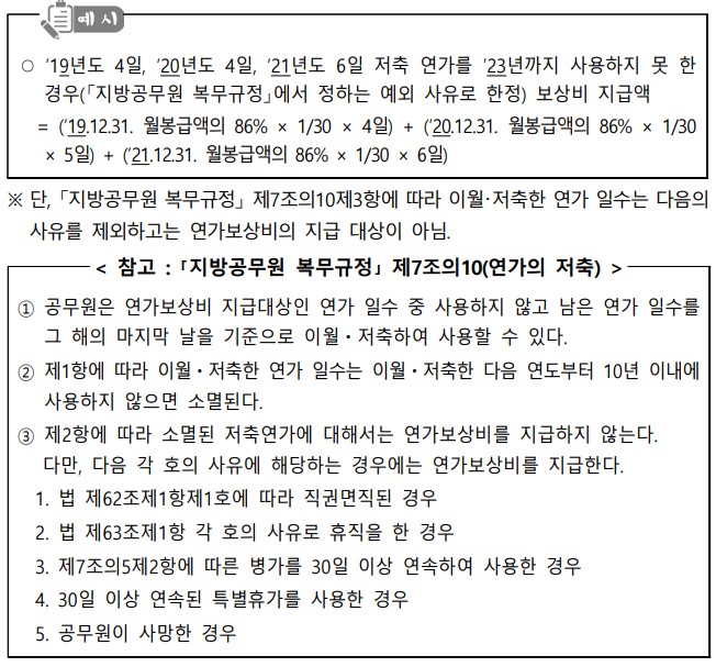 ○ 보상비 지급이 가능( 지방공무원 복무규정 제7조의10제3항 각 호에서 정하는 사유에 한함)한 저축연가의 보상비는 각 연가의 저축 당해연도 12월 31일 월봉급액을 기준으로 한다.