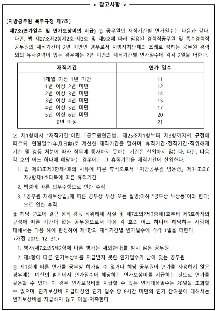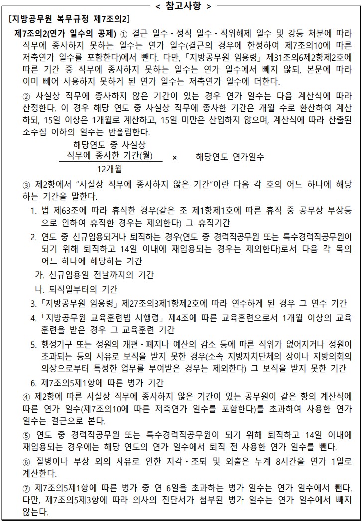 ※ 「지방공무원 복무규정」 제7조의2 제1항에 따른 공제일수 및 제2항, 제3항에 따른 사실상 직무에 종사하지 않은 기간이 있는 사람이 연가일수를 초과하여 사용한 경우에는 같은 규정 제7조의2 제4항에 따라 초과하여 사용한 일수만큼 결근한 것으로 보고 결근시 보수감액 방법에 따르며, 결근의 경우에 한정하여 연가일수를 초과하여 사용하였다면 같은 규정 제7조의10에 따른 저축연가일수에서 차감하되, 저축연가일수가 없을 경우