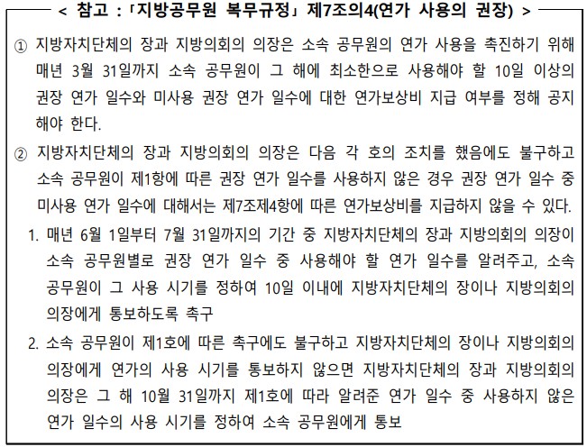 * 지방자치단체의 장과 지방의회의 의장이 권장 연가 일수 중 미사용 권장 연가 일수에 대해 연가보상비를 지급하지 아니하기로 공지하고 「지방공무원 복무규정」 제7조의4제2항 각 호의 조치를 했음에도 불구하고 사용하지 않은 권장 연가 일수는 연가보상일수에 포함되지 않음
