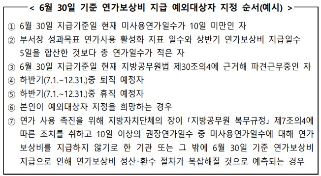 6월 30일 기준 연가보상비를 지급하는 경우, 예외대상자 지정은 아래를 참고하여 각 기관 자율적으로 운영할 수 있다.