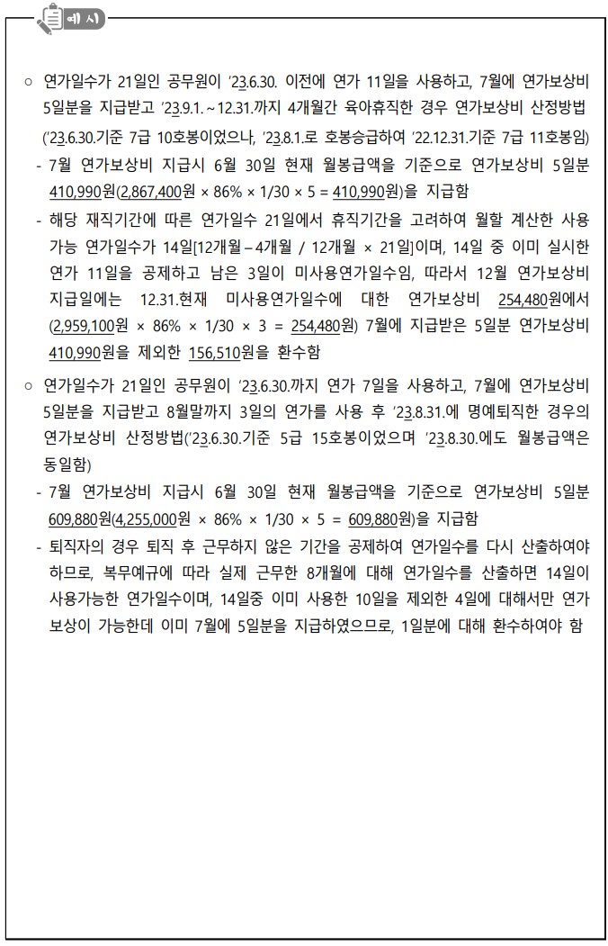 (예) 7월 보수지급일에 연가보상비를 5일분 지급받고 12월 31일 기준 연가보상일수가 3일인 경우 환수금액 : (12.31일 기준 월봉급액 86%×1/30×3일) - 6월 30일 기준 지급받은 연가보상비