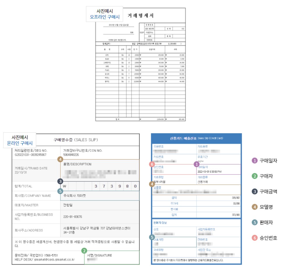 영수증은 구매금액, 구매일시, 승인번호, 구매매장명(사업자번호) 포함하며, 결제 방법에 따라 승인번호가 있는 신용카드매출전표, 현금영수증 제출합니다.